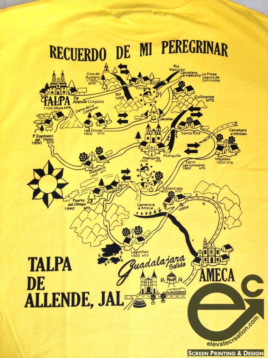 Talpa De Allende, Jal Walk T-shirt Back Published June 11, 2013 at 1536 × 2048 in Gallery ← Previous Next → Black Ink Print on Daisy Gildan Ultra Cotton 2000 T-shirt Like Loading...